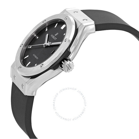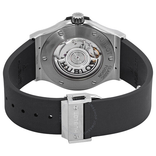 Silver-tone titanium case with a grey rubber strap. Fixed titanium with a black bezel ring bezel. Black dial with silver-tone hands and index hour markers. Dial Type: Analog. Date display at the 3 o'clock position. Hublot Calibre HUB1110 Automatic movement, based upon Sellita SW300-1, containing 21 Jewels, composed of 63 parts, bitting at 28800 vph, and has a power reserve of approximately 42 hours. Scratch resistant sapphire crystal. Transparent case back. Round case shape, case size: 42 mm. Deployment with push button release clasp. Water resistant at 50 meters / 165 feet. Functions: date, hour, minute, second. Additional Info: original box, manual (complete accessories). Classic Fusion Series. Luxury watch style. Watch label: Swiss Made. Hublot Classic Fusion Automatic Black Dial Men's Watch 542.NX.7071.RX.
