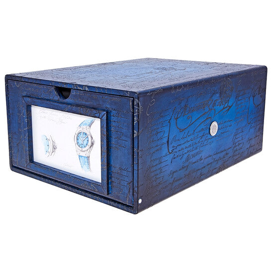 Titanium case with a black rubber strap with a blue (Berluti patinated venezia) leather top. Fixed titanium bezel. Blue (Berluti patinated venezia leather) dial with silver-tone hands and index hour markers. Dial Type: Analog. Hublot calibre HUB1100 automatic movement, based upon Sellita SW300-1, containing 25 Jewels, composed of 63 parts, bitting at 28800 vph, and has a power reserve of approximately 42 hours. Scratch resistant sapphire crystal. Transparent case back. Round case shape. Case size: 45 mm. Deployment clasp. Water resistant at 50 meters / 165 feet. Functions: hour, minute, second. Additional Info: limited edition of 500 pieces. Classic Fusion Berluti Series. Luxury watch style. Watch label: Swiss Made. Hublot Classic Fusion Automatic Limited Berluti Blue Men's Watch 511.NX.050B.VR.BER16.