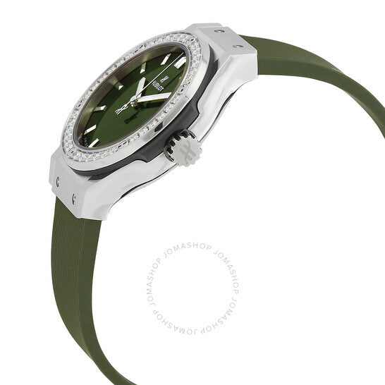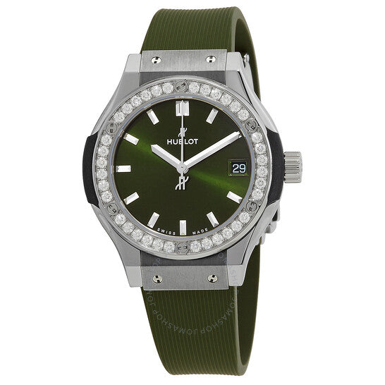 Titanium case with a green rubber strap. Fixed titanium set with diamonds bezel. Green dial with silver-tone hands and index hour markers. Dial Type: Analog. Date display at the 3 o'clock position. Hublot Calibre HUB2912 quartz movement. Scratch resistant sapphire crystal. Pull / push crown. Solid case back. Round case shape, case size: 33 mm. Deployant buckle clasp. Water resistant at 50 meters / 165 feet. Functions: date, hour, minute, second. Classic Fusion Series. Luxury watch style. Watch label: Swiss Made. Hublot Classic Fusion Quartz Diamond Green Dial Ladies Watch 581.NX.8970.RX.1104.