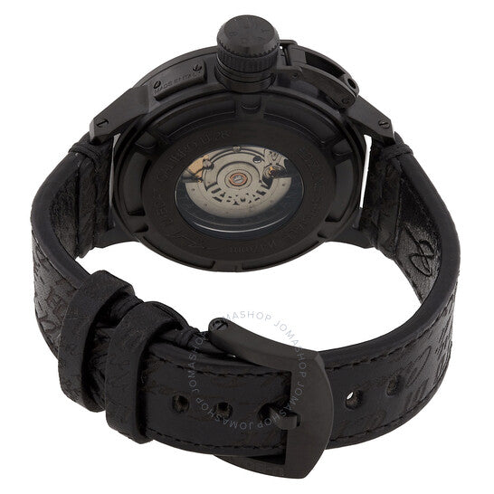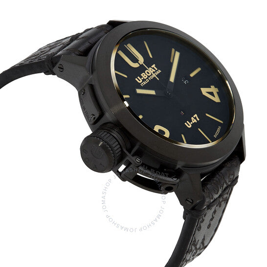 Black stainless steel case with a black leather strap. Fixed black stainless steel bezel. Black dial with black hands and Arabic numeral & index hour markers. Dial Type: Analog. Date display at the 3 o'clock position. Automatic movement. Scratch resistant sapphire crystal. Transparent see through case back. Round case shape, case size: 47 mm. Buckle clasp. Water resistant at 100 meters / 330 feet. Functions: date, hour, minute, second. Classico U-47 Series. Casual watch style. U-Boat Classico U-47 Automatic Black Dial Men's Watch 9160.