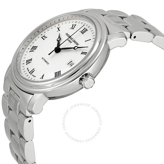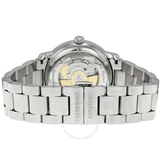 Stainless steel case with a stainless steel bracelet. Fixed stainless steel bezel. Silver dial with black hands and Roman numeral hour markers. Minute markers around the outer rim. Dial Type: Analog. Date display appears at the 3 o'clock position. Automatic movement with a 38 hour power reserve. Scratch resistant sapphire crystal. Push / pull crown. Skeleton case back. Case diameter: 38 mm. Case thickness: 10 mm. Round case shape. Band width: 18 mm. Deployment clasp with push button. Water resistant at 60 meters / 200 feet. Functions: date, hour, minute, second. Dress watch style. Watch label: Swiss Made. Frederique Constant Classics Chopin Automatic Silver Dial Men's Watch 303MC3P6B.