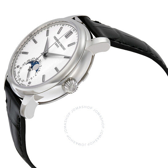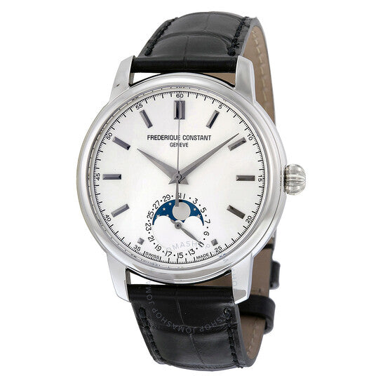 Silver-tone stainless steel case with a black (alligator) leather strap. Fixed stainless steel bezel. Silver dial with grey hands and index hour markers. Minute markers around the outer rim. Dial Type: Analog. Date display at the 6 o'clock position. Combination date and moonphase subdials. Frederique Constant Calibre FC-715 automatic movement with a 42-hour power reserve. Scratch resistant sapphire crystal. Pull / push crown. Hinged solid case back. Round case shape, case size: 40.5 mm, case thickness: 12.4 mm. Band width: 18.5 mm. Buckle clasp. Water resistant at 30 meters / 100 feet. Functions: date, hour, minute, second. Luxury watch style. Watch label: Swiss Made. Item Variations: FC 715S4H6, FC.715S4H6, FC715S4H6. Frederique Constant Classics Moonphase Automatic Men's Watch FC-715S4H6.