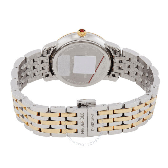 Two-tone (silver-tone and yellow gold-tone) stainless steel & yellow gold case and bracelet. Fixed gold-tone stainless steel bezel. Blue dial with gold-tone hands and diamond-index hour markers. Dial Type: Analog. Ronda Caliber FC-206 (Base 706) quartz movement. Pull / push crown. Solid case back. Round case shape, case size: 30 mm, case thickness: 7.65 mm. Band width: 15 mm. Fold over clasp with a safety release. Water resistant at 30 meters / 100 feet. Functions: hours, minutes, moonphase. Classics Series. Dress watch style. Watch label: Swiss Made. Frederique Constant Classics Quartz Diamond Blue Dial Ladies Watch FC-206MPND1S3B.