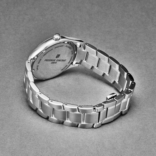 Silver-tone stainless steel case and bracelet. Fixed silver-tone stainless steel bezel. Silver-tone dial with silver-tone hands and index hour markers. Minute markers around the outer rim. Dial Type: Analog. Luminescent hands. Date display at the 3 o'clock position. Frederique Constant Calibre FC-220 quartz movement. Scratch resistant sapphire crystal. Pull / push crown. Solid case back. Round case shape, case size: 40 mm, case thickness: 8.61 mm. Band width: 20 mm, band length: 8 inches. Deployment with push button release clasp. Water resistant at 50 meters / 165 feet. Functions: date, hour, minute. Additional Info: hours, minutes, date. Classics Series. Luxury watch style. Watch label: Swiss Made. Frederique Constant Classics Quartz Silver Dial Men's Watch FC-220SS5B6B.