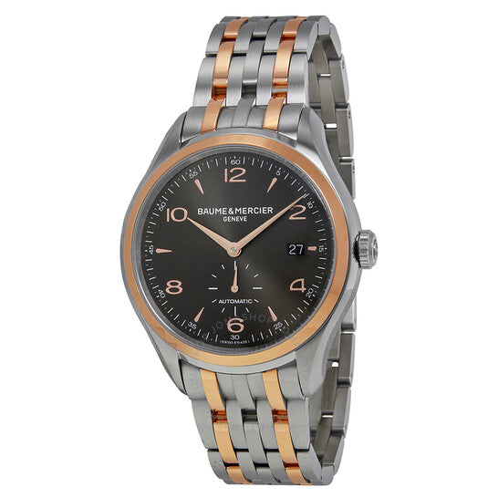 Stainless steel case with a two-tone (silver and rose gold-plated) stainless steel bracelet. Fixed rose gold-plated bezel. Black dial with rose gold-tone hands and alternating Arabic numeral and index hour markers. Minute markers around the outer rim. Dial Type: Analog. Date display at the 3 o'clock position. Seconds sub-dial at the 6 o'clock position. Caliber Sellita SW 260-1 automatic movement with a 42-hour power reserve. Scratch resistant sapphire crystal. Pull / push crown. Transparent case back. Round case shape, case size: 41 mm, case thickness: 12 mm. Band width: 20 mm. Deployment clasp. Water resistant at 50 meters / 165 feet. Functions: power reserve 38 hours, date, hour, minute, second. Dress watch style. Watch label: Swiss Made. Item Variations: A10210, 10210. Baume Et Mercier Clifton Automatic Black Dial Two-Tone Men's Watch 10210.