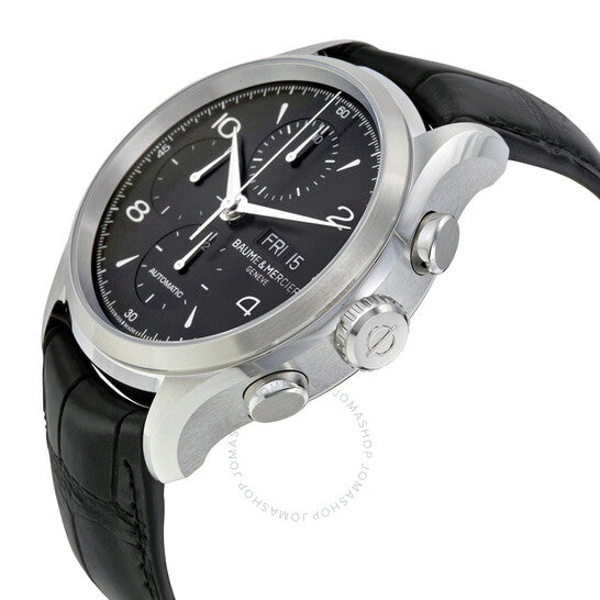 Stainless steel case with a black leather strap. Fixed stainless steel bezel. Black dial with silver-tone hands and Arabic numeral and index hour markers. Minute markers around the outer rim. Dial Type: Analog. Day of the week and date display at the 3 o'clock position. Chronograph - three sub-dials displaying: 60 second, 30 minute and 12 hour. Automatic movement with a 48-hour power reserve. Scratch resistant sapphire crystal. Skeleton case back. Case size: 43 mm. Round case shape. Deployment clasp. Water resistant at 50 meters / 165 feet. Functions: power reserve 48 hours chronograph, date, day, hour, minute, second. Dress watch style. Watch label: Swiss Made. Baume Et Mercier Clifton Chronograph Black Dial Men's Watch 10211.