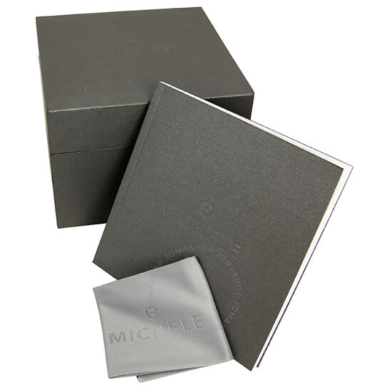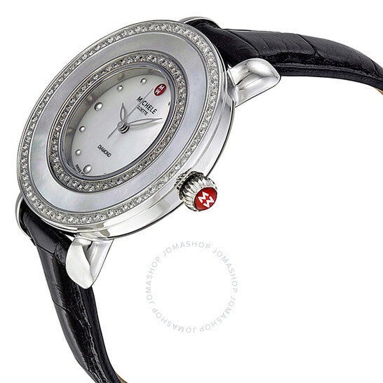 Stainless steel case with a black leather strap. Fixed stainless steel bezel set with 144 diamonds. Mother of pearl dial with silver-tone hands and diamond hour markers. Dial Type: Analog. Quartz movement. Scratch resistant sapphire crystal. Pull / push crown. Solid case back. Case diameter: 38 mm. Case thickness: 8.5 mm. Round case shape. Band width: 16 mm. Tang clasp. Water resistant at 50 meters / 165 feet. Functions: date, hour, minute, second. Dress watch style. Michele Cloette Diamond Black Alligator Ladies Watch MWW20E000002.