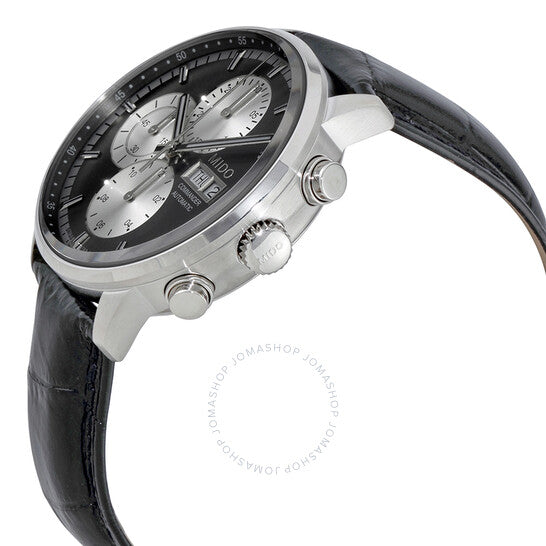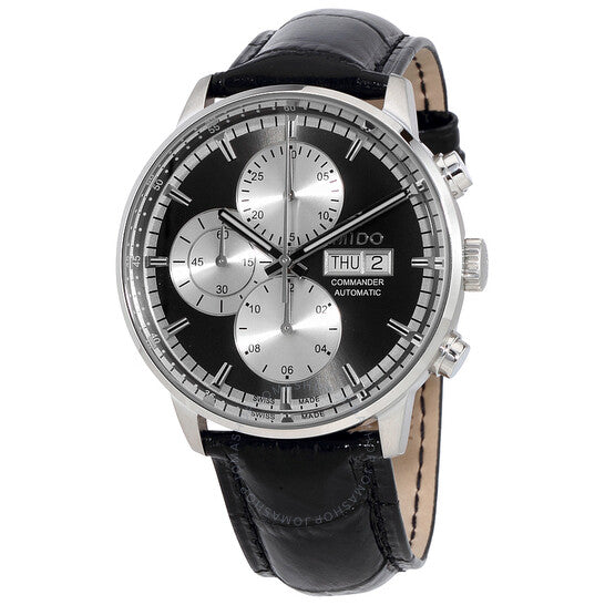 Stainless steel case with a black leather strap. Fixed stainless steel bezel. Black dial with luminous silver-tone hands and index hour markers. Minute markers. Arabic numeral minute markers (at 5 minute intervals) around the outer rim. Dial Type: Analog. Luminescent hands and markers. Day of the week and date display at the 3 o'clock position. Chronograph - three sub-dials displaying: 60 second, 30 minute and 12 hour. Mido calibre 1320 automatic movement, based upon Valjoux 7750, containing 25 Jewels, bitting at 28800 vph, and has a power reserve of approximately 48 hours. Scratch resistant sapphire crystal. Pull / push crown. Transparent case back. Round case shape. Case size: 42 mm. Case thickness: 14.89 mm. Band width: 22 mm. Deployment clasp. Water resistant at 50 meters / 165 feet. Functions: chronograph, day, date, hour, minute, second. Commander II Series. Sport watch style. Watch label: Swiss Made. Mido Commander II Automatic Black Dial Men's Watch M0164141606100.