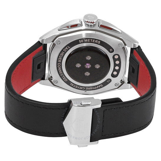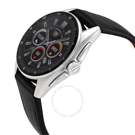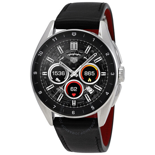 Silver-tone stainless steel case with a black leather strap. Fixed black ceramic bezel. Black dial with silver-tone hands and index hour markers. Hour markers around the outer rim. Dial Type: Analog-digital. Luminescent hands and markers. Date display between 4 and 5 o'clock position. Quartz movement. Scratch resistant sapphire crystal. Pull / push crown. Solid case back. Round case shape, case size: 42 mm. Folding clasp. Water resistant at 50 meters / 165 feet. Functions: date, hour, minute, second. Connected Series. Sport watch style. Tag Heuer Connected Analog-Digital Smart Watch SBR8010.BC6608.