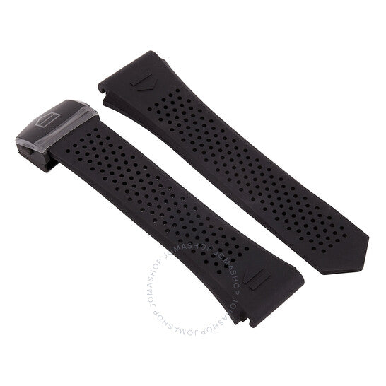 Black titanium case with a rubber strap. Fixed black ceramic bezel. Black dial with black hands and index hour markers. Minute markers around the outer rim. Dial Type: Analog-digital. Date display between 4 and 5 o'clock position. Tag Heuer Calibre E4 quartz movement. Scratch resistant sapphire crystal. Pull / push crown. Solid case back. Round case shape, case size: 45 mm, case thickness: 15.27 mm. Band width: 22.09 mm. Buckle clasp. Water resistant at 50 meters / 165 feet. Functions: date, hour, minute, second, heart rate, compass, microphone, barometer, Bluetooth. Additional Info: wear os by google, android 8.0 + (excluding go edition) / ios 15.0 +. Connected Series. Sport watch style. Tag Heuer Connected Quartz Analog-Digital Black Dial Men's Smart Watch SBR8A80.EB0259.