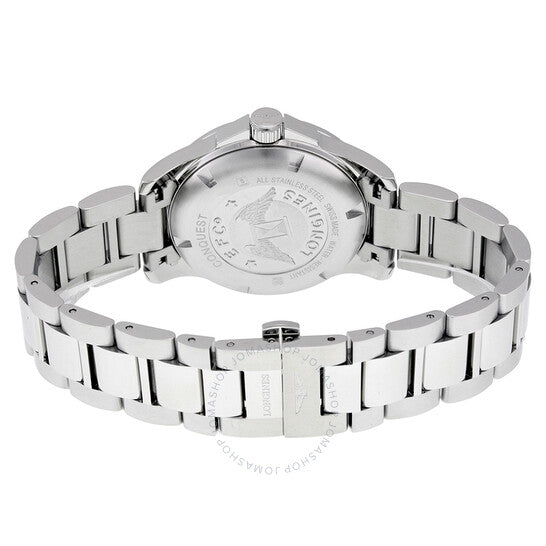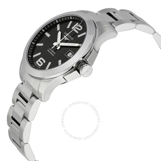 Stainless steel case with a stainless steel bracelet. Fixed stainless steel bezel. Black dial with luminous hands and index hour markers. Arabic numerals mark the 6 and 12 o'clock position. Minute markers around the outer rim. Dial Type: Analog. Luminescent hands and markers. Date display at the 3 o'clock position. Automatic movement with a 38-hour power reserve. Scratch resistant sapphire crystal. Solid case back. Case diameter: 39 mm. Round case shape. Deployment clasp. Water resistant at 300 meters / 1000 feet. Functions: date, hour, minute, second. Luxury watch style. Watch label: Swiss Made. Longines Conquest Automatic Black Dial Stainless Steel Men's Watch L36764586