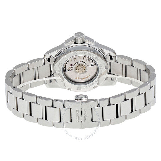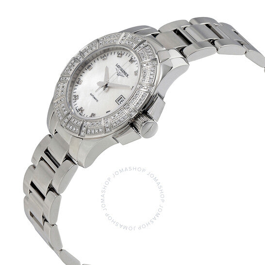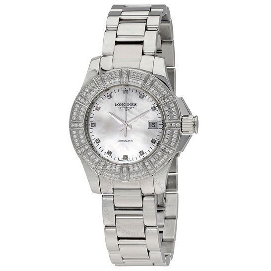 Stainless steel case with a stainless steel bracelet. Fixed stainless steel set with double row of diamonds. Mother of pearl dial with silver-tone hands and diamond hour markers. Minute markers around the outer rim. Dial Type: Analog. Date display at the 3 o'clock position. Longines calibre L595 automatic movement with a 40-hour power reserve. Scratch resistant sapphire crystal. Transparent case back. Case size: 31 mm. Case thickness: 15 mm. Round case shape. Deployment clasp with a push button release. Water resistant at 300 meters / 1000 feet. Functions: date, hour, minute, second. Luxury watch style. Watch label: Swiss Made. Item Variations: L3 180 0 87 6, L3-180-0-87-6, L3/180/0/87/6, L31800876. Longines Conquest Automatic Mother of Pearl Dial Ladies Watch L3.180.0.87.6.