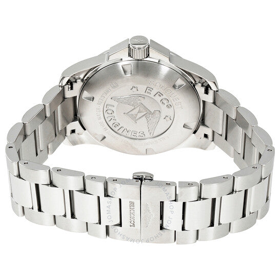Stainless steel case with a stainless steel bracelet. Fixed stainless steel bezel. Black dial with luminous silver-tone hands and index hour markers. Arabic numerals mark the 6 and 12 o'clock positions. Minute markers around the outer rim. Dial Type: Analog. Luminescent hands and markers. Date display at the 3 o'clock position. Longines calibre 157 quartz movement. Scratch resistant sapphire crystal. Screw down crown. Solid case back. Case size: 43 mm. Case thickness: 11.5 mm. Round case shape. Band width: 22 mm. Fold over clasp with a push button release. Water resistant at 300 meters / 1000 feet. Functions: date, hour, minute, second. Luxury watch style. Watch label: Swiss Made. Longines Conquest Black Dial Stainless Steel Men's Watch L37604566.