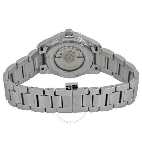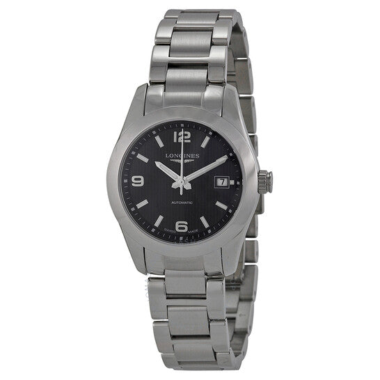Stainless steel case with a stainless steel bracelet. Fixed stainless steel bezel. Black dial with silver-tone hands and index hour markers. Arabic numerals mark the 6, 9 and 12 o'clock positions. Minute markers around the outer rim. Dial Type: Analog. Luminescent hands and markers. Date display at the 3 o'clock position. Longines calibre L595 automatic movement with 40 hour power reserve. Scratch resistant sapphire crystal. Pull / push crown. Skeleton case back. Case diameter: 29.5 mm. Round case shape. Deployment clasp. Water resistant at 50 meters / 165 feet. Functions: date, hour, minute, second. Dress watch style. Longines Conquest Classic Black Dial Stainless Steel Ladies Watch L22854566.