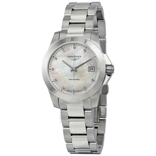Stainless steel case with a stainless steel bracelet. Fixed stainless steel bezel. Mother of pearl dial with silver-tone hands and diamond hour markers. Minute markers around the outer rim. Dial Type: Analog. Date display at the 3 o'clock position. Longines calibre L156 quartz movement. Scratch resistant sapphire crystal. Screw down crown. Solid case back. Round case shape. Case size: 34 mm. Case thickness: 9 mm. Band width: 17 mm. Fold over clasp. Water resistant at 300 meters / 1000 feet. Functions: date, hour, minute, second. Dress watch style. Watch label: Swiss Made. Longines Conquest Mother of Pearl Dial Ladies Watch L3.377.4.87.6.