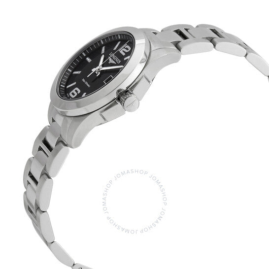 Silver-tone stainless steel case and bracelet. Fixed silver-tone stainless steel bezel. Black dial with silver-tone hands and index hour markers. Minute markers around the outer rim. Dial Type: Analog. Date display at the 3 o'clock position. Quartz movement. Scratch resistant sapphire crystal. Round case shape, case size: 29 mm. Fold over clasp. Water resistant at 300 meters / 1000 feet. Functions: date, hour, minute, second. Additional Info: original box, international warranty card, manual (complete accessories). Conquest Series. Luxury watch style. Watch label: Swiss Made. Longines Conquest Quartz Black Dial Ladies Watch L33764586.