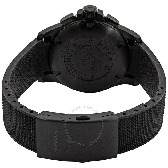 Black PVD stainless steel case with a black rubber strap. Fixed black PVD bezel. Silver dial with luminous grey hands and index hour markers. An Arabic numeral appears at the 12 o'clock position. Arabic numeral minute markers (at 5 minute intervals). Minute markers around the outer rim. Dial Type: Analog. Luminescent hands and markers. Date display between the 4 and 5 o'clock positions. Chronograph - three sub-dials displaying: 60 second, 30 minute and 12 hour. Longines calibre L289.2 quartz movement. Scratch resistant sapphire crystal. Solid case back. Round case shape.Case size: 42 mm. Band width: 22 mm. Deployment clasp with a push button release. Water resistant at 50 meters / 165 feet. Functions: perpetual calendar, date, hour, minute, second, battery eol indicator, shock resistant, magnetic resistant. Conquest V.h.p. Series. Casual watch style. Watch label: Swiss Made. Longines Conquest V.H.P. Chronograph Quartz Silver Dial Men's Watch L3.717.2.76.9.
