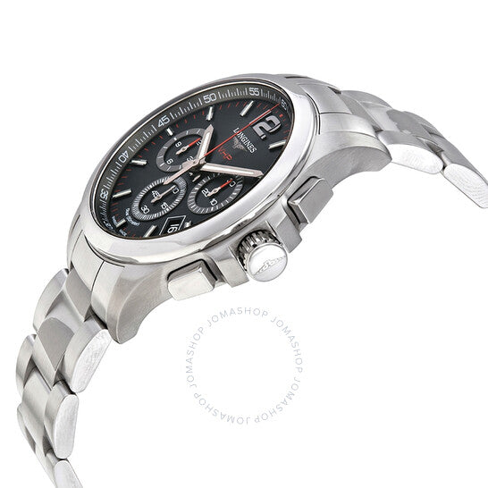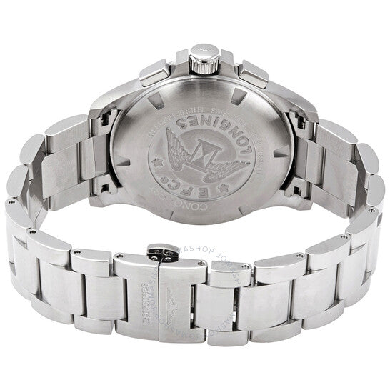 Stainless steel case with a stainless steel bracelet. Fixed stainless steel bezel. Black dial with luminous silver-tone hands and index hour markers. An Arabic numeral appears at the 12 o'clock position. Minute markers around the outer rim. Dial Type: Analog. Luminescent hands and markers. Date display between the 4 and 5 o'clock positions. Chronograph - three sub-dials displaying: 60 second, 30 minute and 12 hour. Longines calibre L289.2 quartz movement. Scratch resistant sapphire crystal. Pull / push crown. Solid case back. Round case shape. Case size: 42 mm. Band width: 21 mm. Triple fold over clasp with a safety release. Water resistant at 50 meters / 165 feet. Functions: chronograph, perpetual calendar, date, hour, minute, second, battery eol indicator, shock resistant, magnetic resistant. Luxury watch style. Watch label: Swiss Made. Longines Conquest V.H.P. Perpetual Chronograph Quartz Black Dial Men's Watch L37174566.