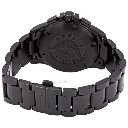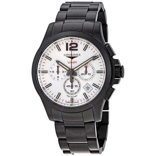 Black PVD stainless steel case and bracelet. Fixed black PVD bezel. Silver-tone dial with luminous silver-tone hands and index hour markers. An Arabic numeral appears at the 12 o'clock position. minute markers around the outer rim. Dial Type: Analog. Luminescent hands and markers. Date display between the 4 and 5 o'clock positions. Chronograph - three sub-dials displaying: 60 second, 60 minute and 12 hour. Longines calibre L289 quartz movement. Scratch resistant sapphire crystal. Pull / push crown. Solid case back. Round case shape. Case size: 44 mm. Band width: 22 mm. Triple fold over clasp with a safety release. Water resistant at 50 meters / 165 feet. Functions: chronograph, perpetual calendar, date, hour, minute, second, battery eol indicator, shock resistant, magnetic resistant. Luxury watch style. Watch label: Swiss Made. Longines Conquest V.H.P. Perpetual Chronograph Quartz Silver Dial Men's Watch L37272766.