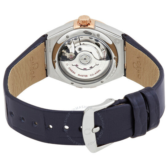 Silver-tone stainless steel case with a blue leather strap. Fixed 18kt rose gold bezel set with diamonds. Blue dial with rose gold-tone hands and diamond hour markers. Dial Type: Analog. Date display at the 6 o'clock position. Omega Calibre 8700 automatic movement with a 50-hour power reserve. Scratch resistant sapphire crystal. Pull / push crown. Transparent case back. Round case shape, case size: 29 mm. Band width: 17.6 mm. Water resistant at 50 meters / 165 feet. Functions: date, hour, minute, second, co-axial escapement, chronometer, magnetic resistant. Constellation Series. Dress watch style. Watch label: Swiss Made. Omega Constellation Automatic Chronometer Diamond Blue Dial Ladies Watch 131.28.29.20.99.003.
