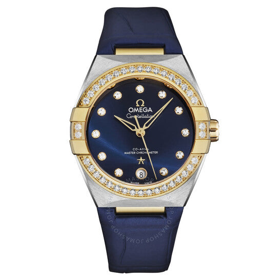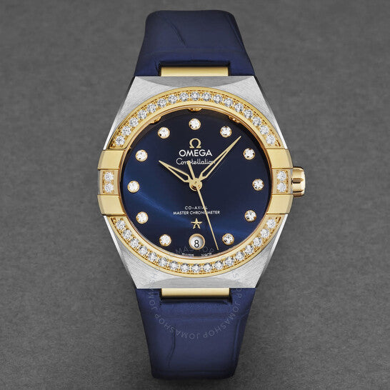 Silver-tone stainless steel case with a blue leather strap. Fixed 18kt yellow gold bezel set with diamonds. Blue dial with 18kt yellow gold hands and diamond hour markers. Dial Type: Analog. Date display at the 6 o'clock position. Omega Calibre 8800 Automatic movement, containing 35 Jewels, bitting at 25200 vph, and has a power reserve of approximately 55 hours. Scratch resistant sapphire crystal. Pull / push crown. Transparent case back. Round case shape, case size: 36 mm. Band width: 23 mm. Water resistant at 50 meters / 165 feet. Functions: date, hour, minute, second, co-axial escapement, chronometer, magnetic resistant. Constellation Series. Dress watch style. Watch label: Swiss Made. Omega Constellation Automatic Chronometer Diamond Blue Dial Ladies Watch 131.28.36.20.53.001.