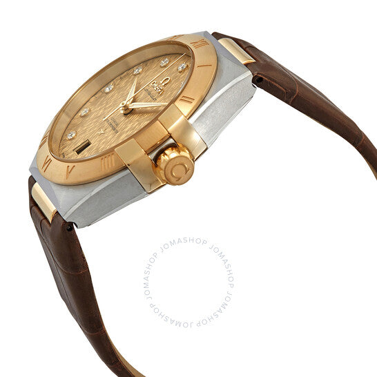 Stainless steel case with a brown (alligator/crocodile) leather strap. Fixed 18kt yellow gold bezel. Champagne dial with luminous 18kt yellow gold hands and diamond hour markers. Minute markers around the outer rim. Dial Type: Analog. Luminescent hands. Date display at the 6 o'clock position. Omega calibre 8800 automatic movement, containing 35 Jewels, bitting at 25200 vph, and has a power reserve of approximately 55 hours. Anti-reflective scratch resistant sapphire crystal. Pull / push crown. Transparent case back. Round case shape. Case size: 39 mm. Band width: 24.2 mm. Deployment clasp. Water resistant at 50 meters / 165 feet. Functions: date, hour, minute, second. Constellation Automatic Series. Luxury watch style. Watch label: Swiss Made. Omega Constellation Automatic Diamond Champagne Dial Men's Watch 13123392058001.