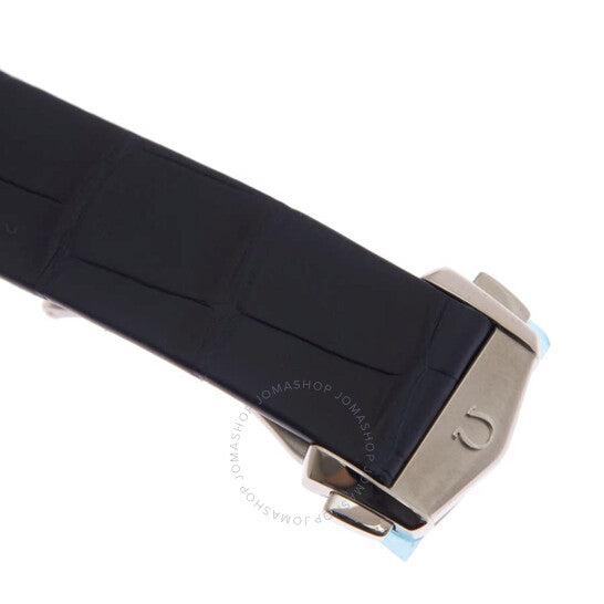 Stainless steel case with a blue (alligator) leather strap. Fixed stainless steel bezel. Grey dial with luminous blue hands and index hour markers. Minute markers around the outer rim. Dial Type: Analog. Luminescent hands. Date display at the 6 o'clock position. Omega calibre 8800 automatic movement, containing 35 Jewels, bitting at 25200 vph, and has a power reserve of approximately 55 hours. Scratch resistant sapphire crystal. Screw down crown. Transparent case back. Round case shape. Case size: 39 mm. Band width: 24.2 mm. Deployment clasp. Water resistant at 50 meters / 165 feet. Functions: date, hour, minute, second, co-axial escapement, chronometer, magnetic resistant. Constellation Co-axial Series. Luxury watch style. Watch label: Swiss Made. Omega Constellation Co-Axial Automatic Chronometer Grey Dial Men's Watch 131.13.39.20.06.002.