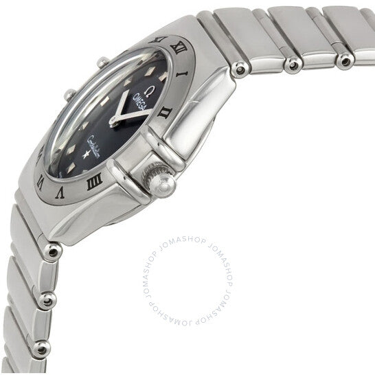 Stainless steel case with a steel bracelet. Fixed stainless steel bezel. Grey dial with silver-tone hands and hour markers. Battery operated quartz movement. Scratch resistant sapphire crystal. Case diameter: 25.5 mm. Case thickness: 7.5 mm. Hidden push button deployment clasp. Water resistant at 30 meters / 100 feet. Omega Constellation My Choice Ladies Watch 1571.51.