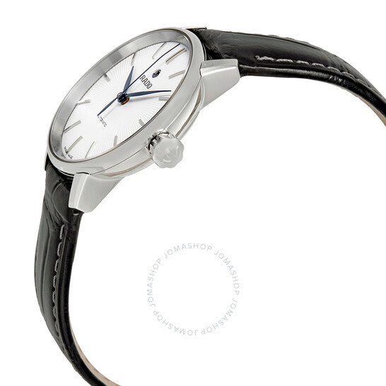 Stainless steel case with a black leather strap. Fixed stainless steel bezel. Silver dial with blue hands and index hour markers. Dial Type: Analog. Rado calibre 561 (ETA 2671) automatic movement with a 38-hour power reserve. Scratch resistant sapphire crystal. Transparent case back. Round case shape, case size: 31.8 mm, case thickness: 9.7 mm. Tang clasp. Water resistant at 50 meters / 165 feet. Functions: date, hour, minute, second. Casual watch style. Watch label: Swiss Made. Rado Coupole Classic S Automatic Silver Dial Ladies Watch R22862045.