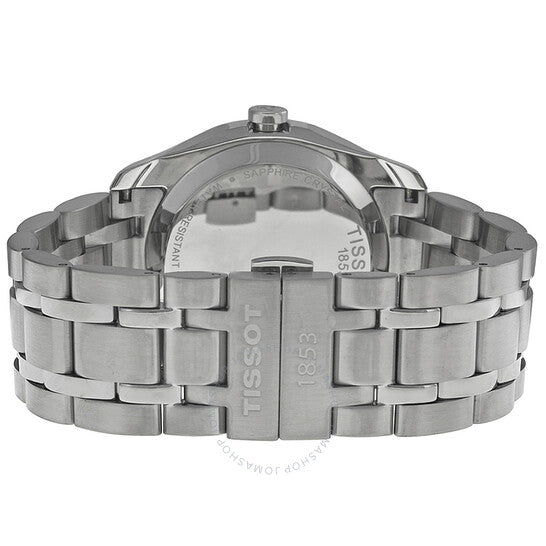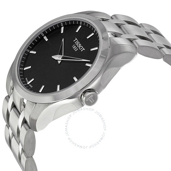 Stainless steel case with a stainless steel bracelet. Fixed stainless steel bezel. Black dial with silver-tone skeleton hands and index hour markers. Minute markers around the outer rim. Dial Type: Analog. ETA caliber E08.311 quartz movement. Scratch resistant sapphire crystal. Pull / push crown. Solid case back. Round case shape. Case size: 39 mm. Case thickness: 10.82 mm. Band width: 23 mm. Butterfly clasp with a push button release. Water resistant at 100 meters / 330 feet. Functions: hour, minute, second. Casual watch style. Watch label: Swiss Made. Item Variations: T0354461105100. Tissot Couturier Black Dial Men's Watch T035.446.11.051.00.