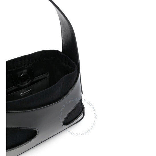 Ferragamo Ladies Shoulder Bag. SKU: 213487 762295. Material: Calfskin;Cotton;Nylon. Color: Black. Size: W:21cm x H:18cm x D:6cm. Ferragamo Cut-Out Calf Leather Shoulder Bag. This shoulder bag features cut-out detailing, a single flat top handle, a concealed magnetic fastening, and a main compartment with an internal card slot. 100% Calf Leather, 70% Nylon, 30% Cotton. Made in Italy.