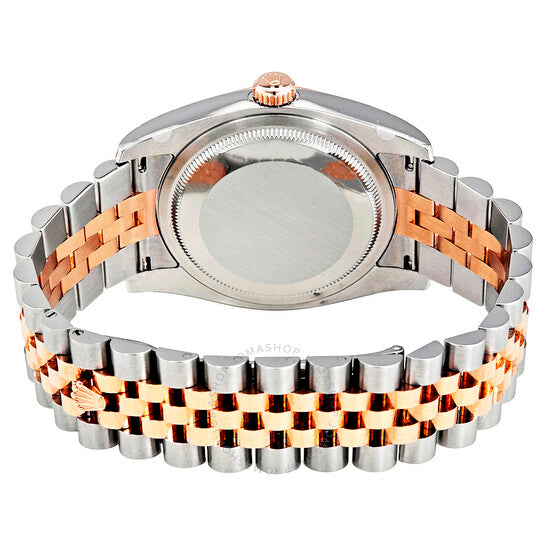 Stainless steel case with a stainless steel Rolex jubilee bracelet with 18kt everose gold center links. Fixed domed 18kt everose gold bezel. Black and champagne dial with rose gold-tone hands and index / Roman numeral hour markers. Minute markers around the outer rim. Dial Type: Analog. Date display at the 3 o'clock position. Rolex calibre 3135 automatic movement with a 48-hour power reserve. Scratch resistant sapphire crystal. Screw down crown. Solid case back. Case size: 36 mm. Round case shape. Concealed crown clasp. Water resistant at 100 meters / 330 feet. Functions: date, hour, minute, second. Luxury watch style. Watch label: Swiss Made. Rolex Datejust Black and Champagne Dial Automatic Men's Watch 116201BKPSJ.