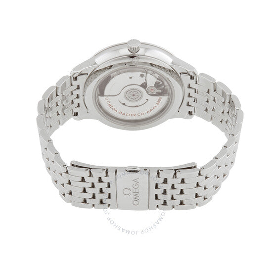 Silver-tone stainless steel case and bracelet. Fixed silver-tone stainless steel bezel. Black dial with rose gold-tone hands and Roman numeral hour markers. Minute markers around the outer rim. Dial Type: Analog. Date display at the 6 o'clock position. Omega Calibre 8800 Automatic movement, containing 35 Jewels, bitting at 25200 vph, and has a power reserve of approximately 55 hours. Scratch resistant sapphire crystal. Transparent see through case back. Round case shape, case size: 40 mm. Fold over clasp with a safety release. Water resistant at 30 meters / 100 feet. Functions: date, hour, minute, second, co-axial escapement, chronometer, magnetic resistant. Additional Info: original box, international warranty card, manual (complete accessories). De Ville Series. Luxury watch style. Watch label: Swiss Made. Omega De Ville Automatic Chronometer Black Dial Men's Watch 434.10.40.20.01.001.