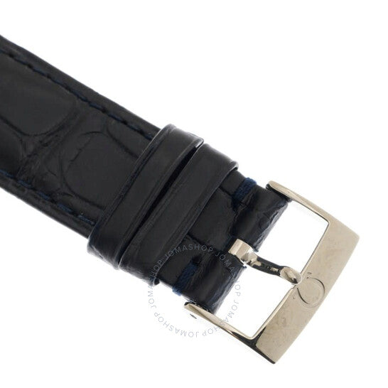 Stainless steel case with a blue leather strap. Fixed stainless steel bezel. Blue dial with rose gold-tone hands and alternating Roman numeral and dot hour markers. Minute markers around the outer rim. Dial Type: Analog. Date display at the 3 o'clock position. Small seconds sub-dial. Ppower reserve indicator. Omega calibre 2627 automatic movement, based upon Omega 2500, containing 29 Jewels, bitting at 25200 vph, and has a power reserve of approximately 48 hours. Scratch resistant sapphire crystal. Solid case back. Round case shape. Case size: 39 mm. Strap width: 20 mm. Tang clasp. Water resistant at 30 meters / 100 feet. Functions: date, hour, minute, small second, power reserve indicator, co-axial escapement, chronometer. Additional Info: original box, international warranty card, manual (complete accessories). De Ville Series. Luxury watch style. Watch label: Swiss Made. Omega De Ville Automatic Chronometer Blue Dial Men's Watch 424.13.40.21.03.003.
