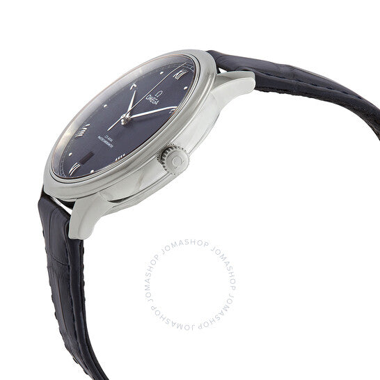 Silver-tone stainless steel case with a blue alligator band. Fixed silver-tone stainless steel bezel. Blue dial with silver-tone hands and Roman numeral hour markers. Minute markers around the outer rim. Dial Type: Analog. Date display at the 6 o'clock position. Omega Calibre 8800 Automatic movement, containing 35 Jewels, bitting at 25200 vph, and has a power reserve of approximately 55 hours. Scratch resistant sapphire crystal. Transparent see through case back. Round case shape, case size: 40 mm. Buckle clasp. Water resistant at 30 meters / 100 feet. Functions: date, hour, minute, second, co-axial escapement, chronometer, magnetic resistant. Additional Info: original box, international warranty card, manual (complete accessories). De Ville Series. Luxury watch style. Watch label: Swiss Made. Omega De Ville Automatic Chronometer Blue Dial Men's Watch 434.13.40.20.03.001.