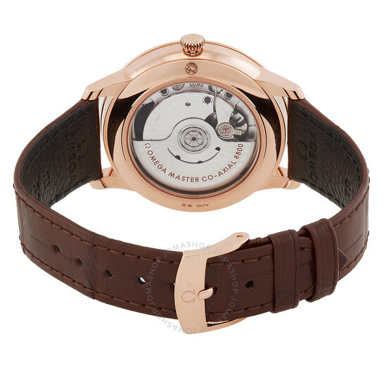 Rose gold-tone 18kt rose gold case with a brown 18kt rose gold bracelet. Fixed rose gold-tone 18kt rose gold bezel. Silver-tone dial with rose gold-tone hands and Roman numeral hour markers. Minute markers around the outer rim. Dial Type: Analog. Date display at the 6 o'clock position. Omega Calibre 8800 Automatic movement, containing 35 Jewels, bitting at 25200 vph, and has a power reserve of approximately 55 hours. Scratch resistant sapphire crystal. Transparent see through case back. Round case shape, case size: 40 mm. Buckle clasp. Water resistant at 30 meters / 100 feet. Functions: date, hour, minute, second, co-axial escapement, chronometer, magnetic resistant. Additional Info: original box, international warranty card, manual (complete accessories). De Ville Series. Luxury watch style. Watch label: Swiss Made. Omega De Ville Automatic Chronometer Silver Dial Men's Watch 434.53.40.20.02.001.