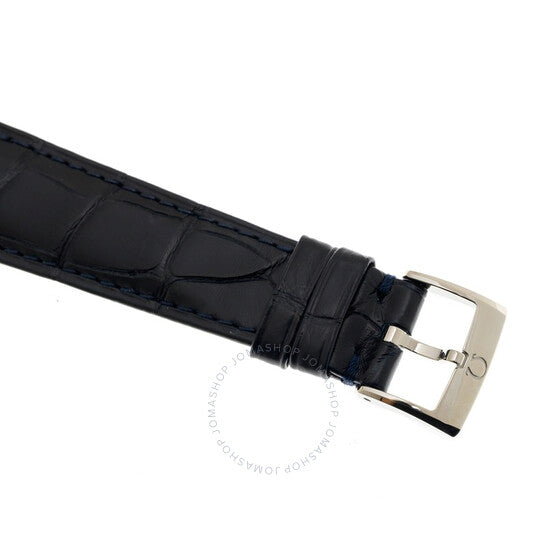 Stainless steel case with a blue (alligator) leather strap. Fixed stainless steel bezel. Blue dial with white gold hands and index hour markers. Minute markers around the outer rim. Dial Type: Analog. Small seconds sub-dial. Omega calibre 8926 hand wind movement with a 72-hour power reserve. Scratch resistant sapphire crystal. Transparent case back. Round case shape. Case size: 40 mm. Band width: 20 mm. Tang clasp. Water resistant at 30 meters / 100 feet. Functions: hour, minute, second. Additional Info: original box, manual (complete accessories). De Ville Series. Luxury watch style. Watch label: Swiss Made. Omega De Ville Hand Wind Blue Dial Men's Watch 435.13.40.21.03.002.