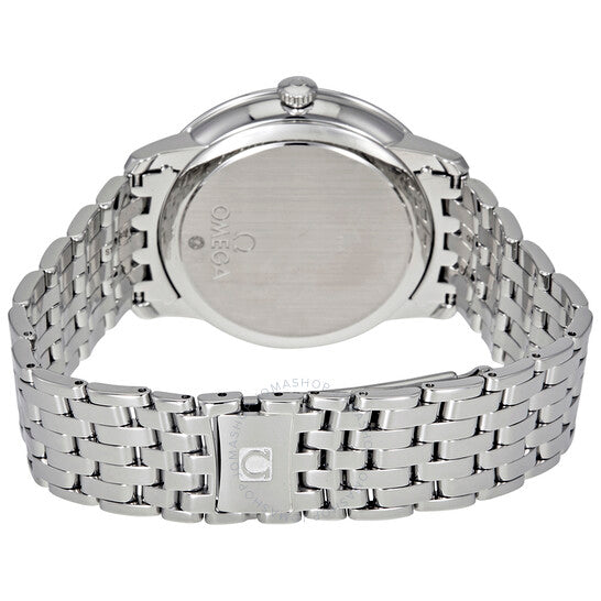 Stainless steel case with a stainless steel bracelet. Fixed stainless steel bezel. Blue dial with silver-tone dauphine-style hands and index hour markers. Roman numerals mark the 3, 6, 9 and 12 o'clock positions. Dial Type: Analog. Date display at the 3 o'clock position. Omega calibre 2500 automatic movement, based upon ETA 2892-A2, containing 27 Jewels, bitting at 25200 vph, and has a power reserve of approximately 48 hours. Scratch resistant sapphire crystal. Pull / push crown. Solid case back. Round case shape. Case size: 39.5 mm. Case thickness: 10 mm. Band width: 20 mm. Hidden fold over clasp. Water resistant at 30 meters / 100 feet. Functions: date, hour, minute, second, co-axial escapement, chronometer. Luxury watch style. Watch label: Swiss Made. Omega De Ville Prestige Automatic Blue Dial Men's Watch 424.10.40.20.03.001.