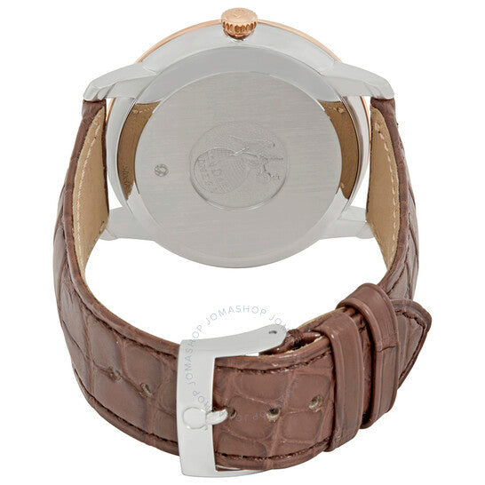 Stainless steel case with a brown (alligator) leather strap. Fixed 18kt rose gold bezel. Silver dial with rose gold-tone dauphine-style hands and alternating Roman numeral and dot hour markers. Minute markers around the outer rim. Dial Type: Analog. Date display at the 3 o'clock position. Omega calibre 2500 automatic movement, based upon ETA 2892-A2, containing 27 Jewels, bitting at 25200 vph, and has a power reserve of approximately 48 hours. Scratch resistant sapphire crystal. Pull / push crown. Solid case back. Round case shape. Case size: 39.5 mm. Case thickness: 10 mm. Band width: 20 mm. Tang clasp. Water resistant at 30 meters / 100 feet. Functions: date, hour, minute, second, co-axial escapement, chronometer. Luxury watch style. Watch label: Swiss Made. Omega De Ville Prestige Automatic Silver Dial Men's Watch 424.23.40.20.02.002.