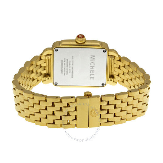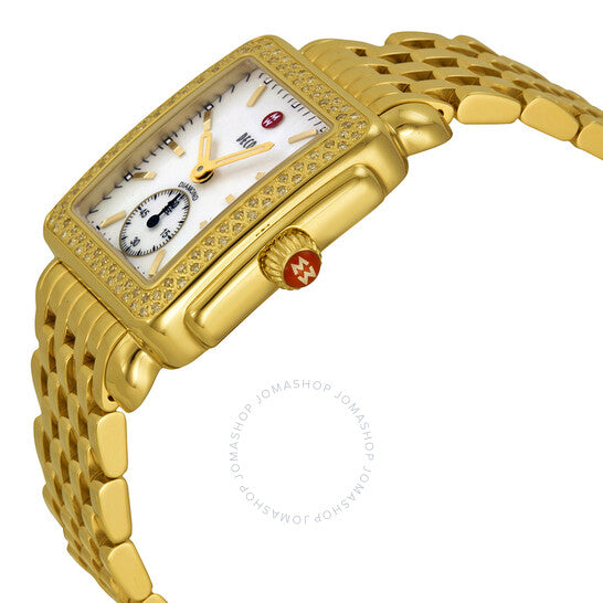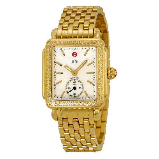 Gold-plated stainless steel case and bracelet. Fixed gold-plated bezel set with diamonds. Mother of pearl dial with luminous hands and stick hour markers. Minute markers around the outer rim. Dial Type: Analog. Luminescent hands and markers. Seconds sub-dial at the 6 o'clock position. Quartz movement. Scratch resistant sapphire crystal. Solid case back. Case dimensions: 29 mm x 31 mm. Rectangle case shape. Deployment clasp. Water resistant at 50 meters/ 165 feet. Functions: hours, minutes, small seconds. Additional Info: head: mw06v01b0025, strap: ms16dm246710. Dress watch style. Watch label: Swiss Movement. Michele Deco-16 Mother of Pearl Dial Diamond Bezel Ladies Watch MWW06V000003.
