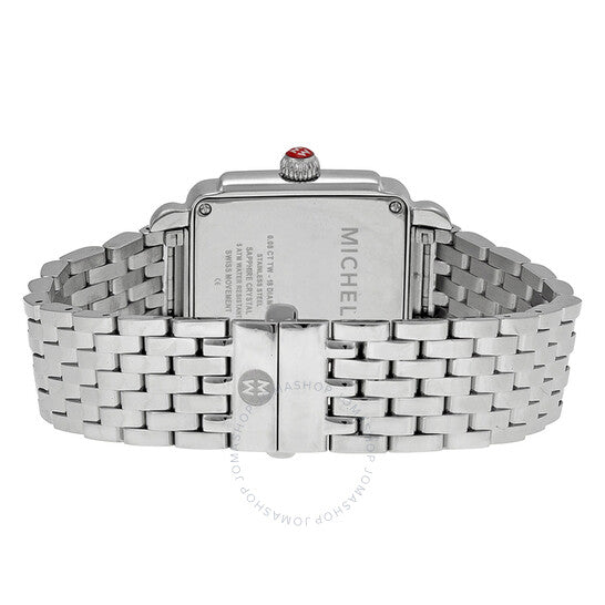 Stainless steel case with a stainless steel bracelet. Fixed stainless steel bezel. Blue mother of pearl dial with silver-tone hands and diamond (0.08 ct.) hour markers. Minute markers around the outer rim. Dial Type: Analog. Seconds sub-dial at the 6 o'clock position. Quartz movement. Scratch resistant sapphire crystal. Solid case back. Case diameter: 29 mm. Case thickness: 8 mm. Rectangle case shape. Band width: 16 mm. Deployment clasp with a push button release. Water resistant at 50 meters / 165 feet. Functions: hour, minute, second. Additional Info: bracelet is interchangeable with any 16mm michele strap. Dress watch style. Watch label: Swiss Movt. Michele Deco 16 Blue Pearl Diamond Dial Bracelet Ladies Watch MWW06V000037.