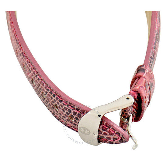 Stainless steel case. Pink lizard bracelet. Mother of pearl dial with chronograph and date display at 6 o'clock. 108 diamond (0.60 carats) bezel. Scratch resistant sapphire crystal. 33mm x 46mm case diameter. Quartz movement. Water resistant at 50 meters (165 feet).