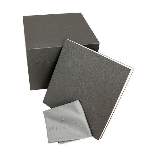 Stainless steel case with a stainless steel bracelet. Fixed silver-tone and white ceramic bezel set with diamonds. White dial with silver-tone hands and index hour markers. Minute markers around the outer rim. Dial Type: Analog. Luminescent hands and markers. Date display at the 6 o'clock position. Chronograph - two sub-dials displaying: 60 second and 30 minute. Day of the week sub-dial at the 6 o'clock position. Quartz movement. Scratch resistant sapphire crystal. Pull / push crown. Solid case back. Case diameter: 33 mm x 35 mm. Rectangle case shape. Band width: 18 mm. Deployment clasp. Water resistant at 50 meters / 165 feet. Functions: chronograph, date, hour, minute, second. Additional Info: the stainless and ceramic bracelet is interchangeable with any 18mm michele strap.. Dress watch style. Michele Deco Diamond Ladies Watch MWW06P000189.