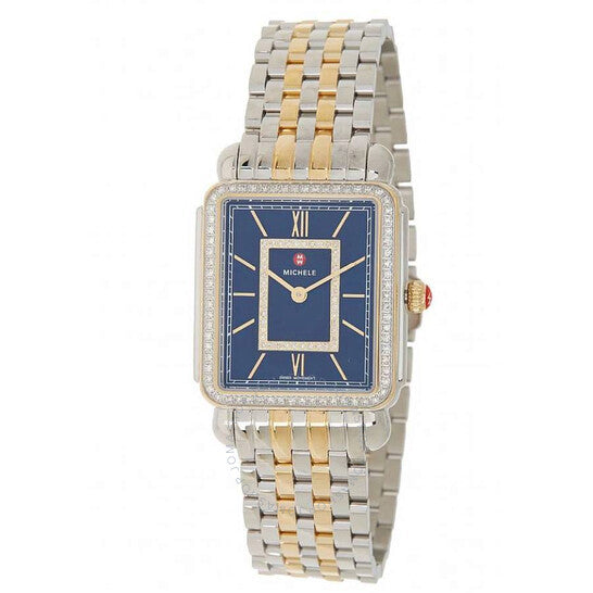 Silver-tone stainless steel case with a two-tone (silver-tone and yellow gold) stainless steel & 18kt yellow gold bracelet. Fixed 18kt yellow gold bezel set with diamonds. Blue dial with gold-tone hands and index-Roman numeral hour markers. Roman numerals mark the 6 and 12 o'clock positions. Minute markers around the outer rim. Dial Type: Analog. Quartz movement. Scratch resistant mineral crystal. Pull / push crown. Solid case back. Rectangle case shape, case size: 32 mm. Water resistant at 50 meters / 165 feet. Functions: hour, minute. Deco II Series. Dress watch style. Watch label: Swiss Made. Michele Deco II Quartz Diamond Blue Dial Ladies Watch MWW06X000045.