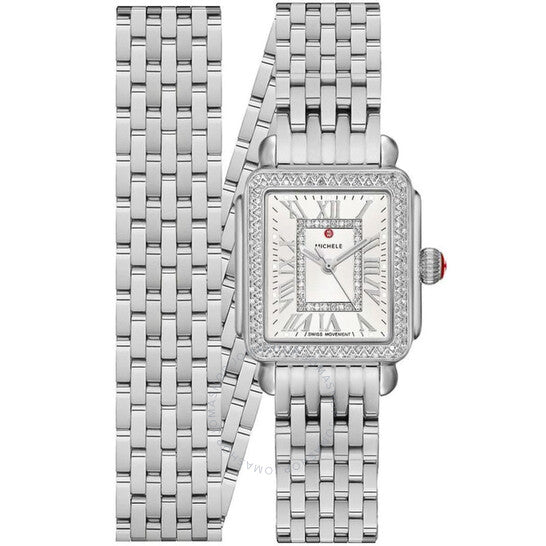 Silver-tone stainless steel case and bracelet. Fixed silver-tone bezel with diamond set. Silver dial with silver-tone hands and Roman numeral hour markers. Minute markers around the outer rim. Dial Type: Analog. Quartz movement. Scratch resistant sapphire crystal. Pull / push crown. Solid case back. Rectangle case shape, case size: 32 mm x 22 mm. Band width: 12 mm. Deployment clasp. Water resistant at 50 meters / 165 feet. Functions: hour, minute, second. Additional Info: total diamond count: 122 diamonds (0.43 cts). Deco Series. Dress watch style. Watch label: Swiss Movt. Michele Deco Madison Quartz Diamond Silver Dial Ladies Watch MWW06D000162.