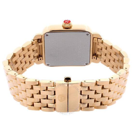 Gold-plated stainless steel case and bracelet. Fixed gold-plated bezel. White silver dial with gold-tone hands and Roman numeral hour markers. Dial Type: Analog. Date display at the 6 o'clock position. Quartz movement. Scratch resistant sapphire crystal. Pull / push crown. Solid case back. Rectangle case shape. Case dimensions: 33 mm x 35 mm. Band width: 18 mm. Butterfly clasp. Water resistant at 50 meters / 165 feet. Functions: date, hour, minute, second. Additional Info: case set with 108 hand-set diamonds (0.71ct). Deco Madison Series. Dress watch style. Michele Deco Madison Quartz Ladies Watch MWW06T000161.