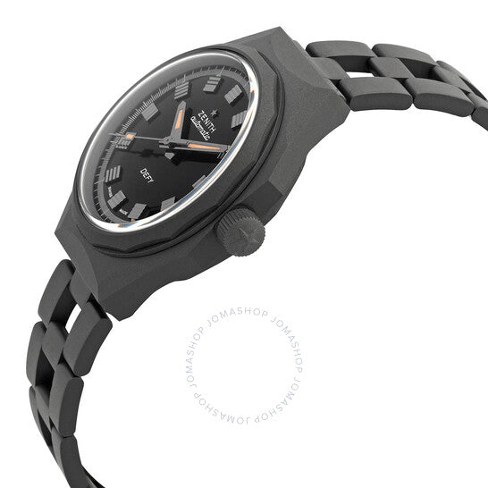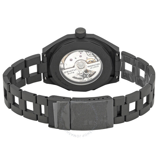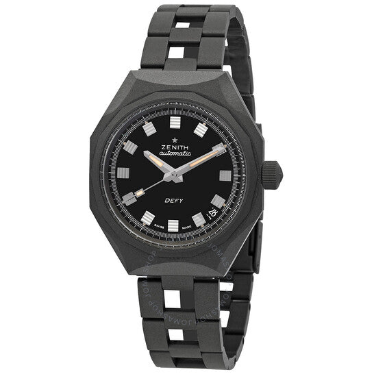 Micoblasted titanium case with a micoblasted titanium "ladder" bracelet bracelet. Fixed micoblasted titanium bezel. Black dial with silver-tone hands and index hour markers. Minute markers around the outer rim. Dial Type: Analog. Luminescent hands and markers. Date display between 4 and 5 o'clock position. Zenith Calibre Elite 670 Automatic movement, based upon Zenith Elite 680, containing 27 Jewels, composed of 144 parts, bitting at 28800 vph, and has a power reserve of approximately 50 hours. Scratch resistant sapphire crystal. Unique case shape, case size: 37 mm. Water resistant at 30 meters / 100 feet. Functions: date, hour, minute, second. Defy Series. Luxury watch style. Watch label: Swiss Made. Zenith Defy Automatic Black Dial Men's Watch 97.A3642.670/21.M3642.