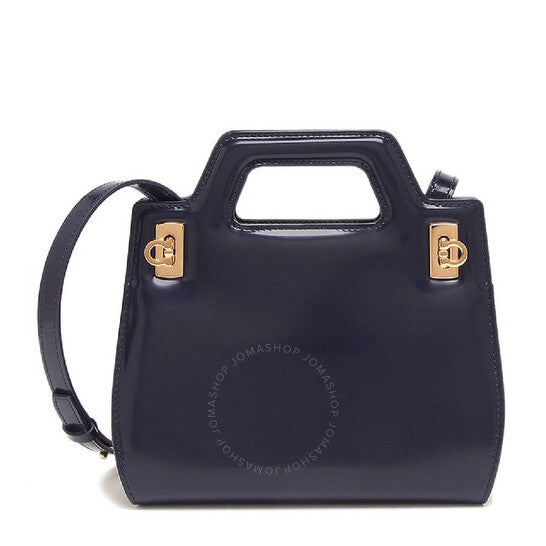 Ferragamo Ladies Mini Bag. SKU: 213485 766574. Color: Blue. Ferragamo Detachable Strap Wanda Bag. This bag is crafted from brushed calfskin and features a lined interior with two flat pockets. It can be carried as a handbag or shoulder bag with the detachable strap, and is secured with a side fastening adorned with a satin-finish steel Gancini accent. Composition: brushed calfskin. Made in Italy.