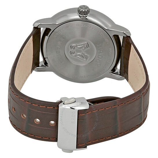 Black plasma high-tech ceramic case with a brown leather strap. Fixed black ceramic bezel. Blue dial with black hands and index hour markers. Minute markers. Dial Type: Analog. Date display at the 6 o'clock position. Quartz movement. Scratch resistant sapphire crystal. Solid case back. Case size: 40 mm. Case thickness: 10 mm. Round case shape. Deployment clasp. Water resistant at 100 meters / 330 feet. Functions: date, hour, minute, second. Luxury watch style. Watch label: Swiss Made. Rado DiaMaster Quartz Blue Dial Ceramic Men's Watch R14135206.