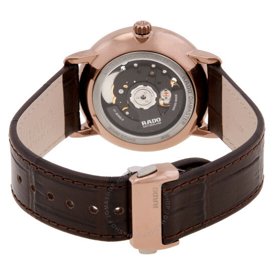 Rose gold-tone (high-tech) ceramic case with a black leather strap. Fixed rose gold-tone (high-tech) ceramic bezel. Black dial with rose gold-tone hands and index hour markers. Dial Type: Analog. Date display above the 6 o'clock position. Rado Calibre 766 automatic movement with a 72-hour power reserve. Scratch resistant sapphire crystal. Pull / push crown. Transparent case back. Round case shape, case size: 41 mm, case thickness: 8.3 mm. Fold over clasp. Water resistant at 50 meters / 165 feet. Functions: date, hour, minute. Additional Info: limited edition: 388 pieces. Diamaster Thinline Series. Luxury watch style. Watch label: Swiss Made. Item Variations: 01.766.6068.3.418. Rado DiaMaster Thinline Automatic Black Dial Men's Watch R14068186.